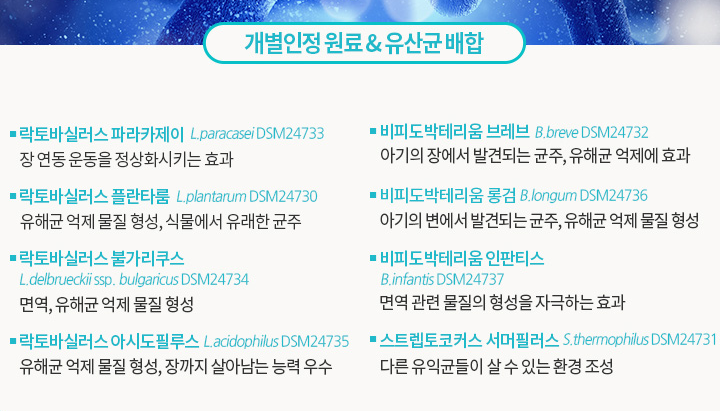 몸에 해로운 균들이 몸속으로 침입했을 때, 프로바이오틱스(유익균)는 유해한 박테리아균들을 물리쳐 몸을 회복시켜주는 기능을 합니다.